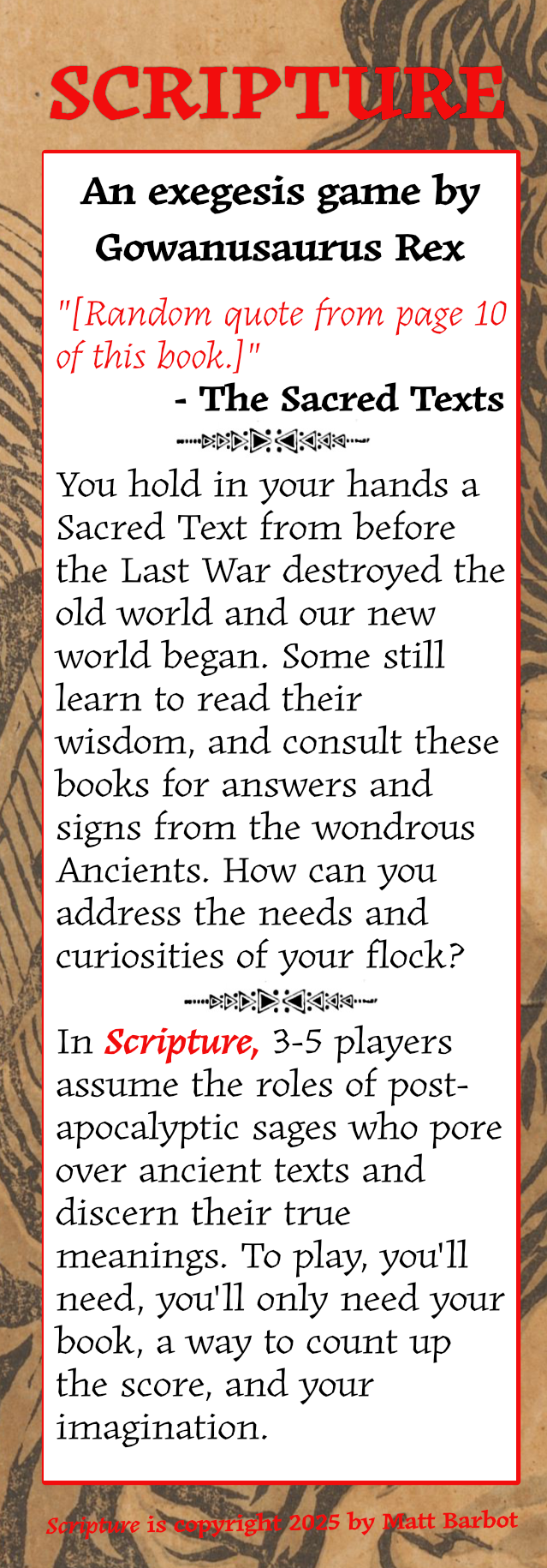 In Scripture, 3-5 players assume the roles of post-apocalyptic sages who pore over ancient texts and discern their true meanings. To play, you'll need, you'll only need your book, this bookmark, a way to count up the score, and your imagination.