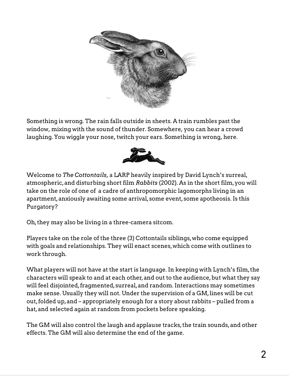 Welcome to The Cottontails, a LARP heavily inspired by David Lynch’s surreal, atmospheric, and disturbing short film Rabbits (2002). As in the short film, you will take on the role of one of a cadre of anthropomorphic lagomorphs living in an apartment, anxiously awaiting some arrival, some event, some apotheosis. Is this Purgatory?