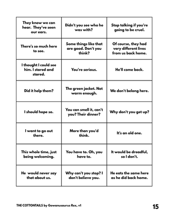 Players take on the role of the three (3) Cottontail siblings, who come equipped with goals and relationships. They will enact scenes, which come with outlines to work through.