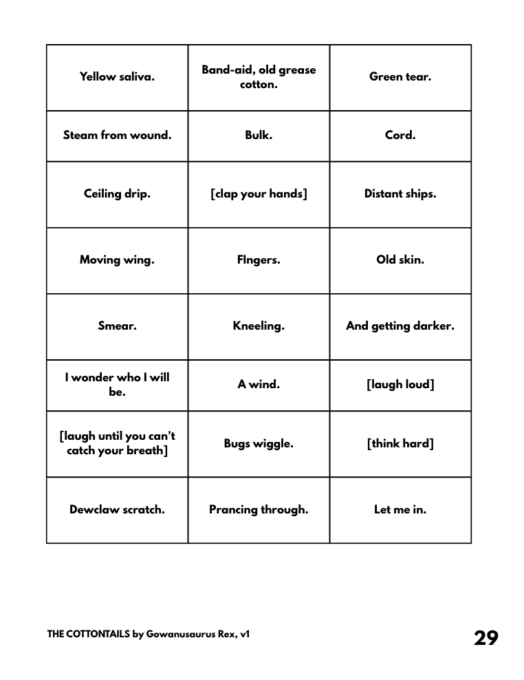 The Cottontails and Other People were created for Metaparadox's Litform LARP Jam.
