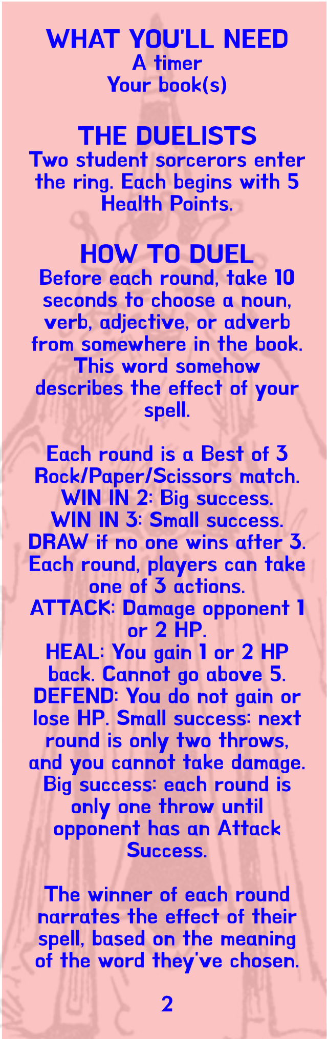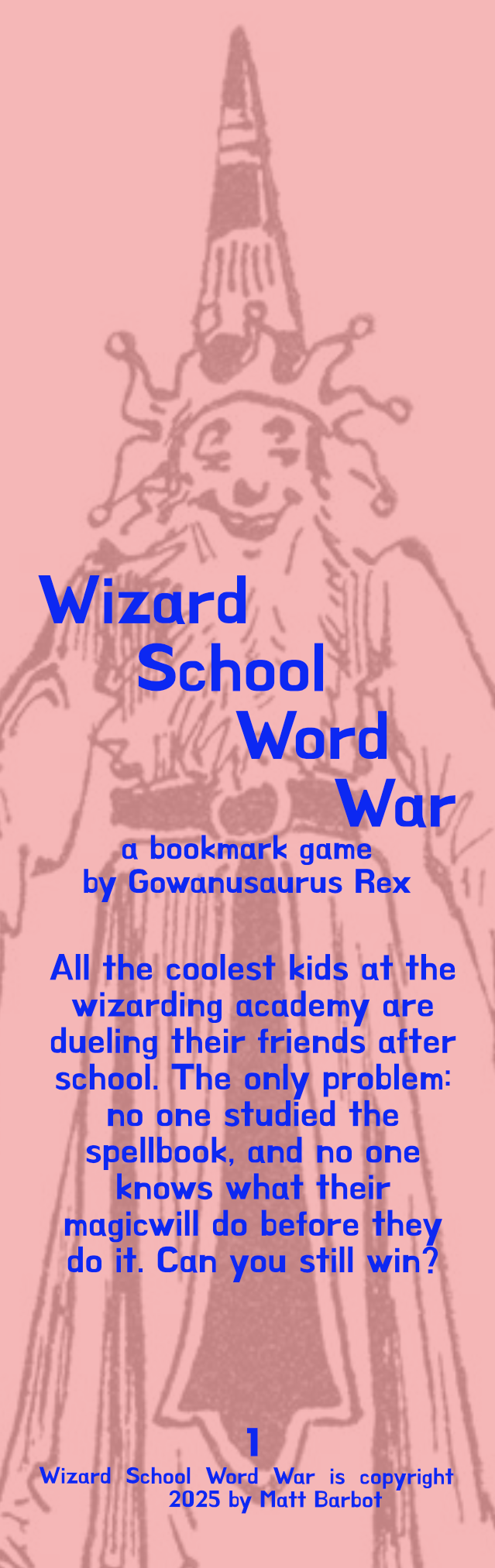 Although I made Scripture first, Wizard School Word War was the first game that occurred to me when the Bookmark Jam was announced, because I was taken by the (I think) delightfully silly premise of having to come up with spell effects based on whatever random word you've wound up with. I think this game is accessible, and can be adjusted for difficulty via the text you choose for your "spellbook." I'm so excited for to hear what you think!